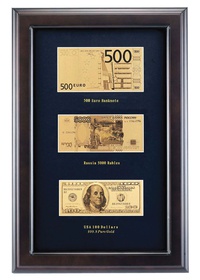 | Номиналы купюр: 500 EUR, 5000 рублей, 100 USD |